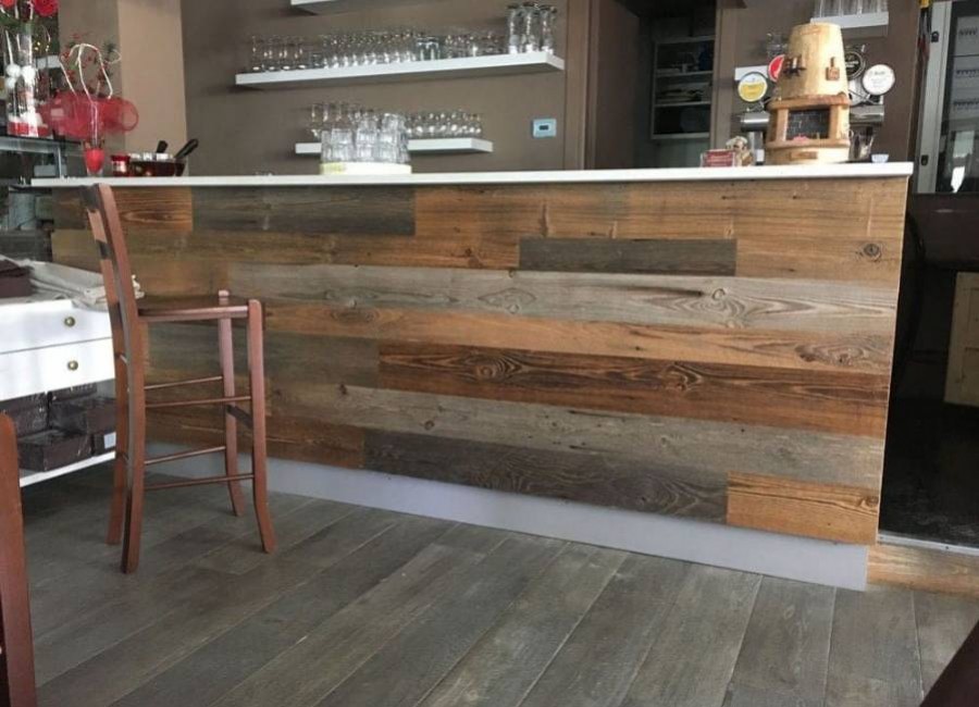 L’utilisation des nos lames de vieux bois adhésives pour le revêtement de ce minibar a permis de lui donner un côté accueillant et convivial, tout en apportant de l’authenticité à la pièce.